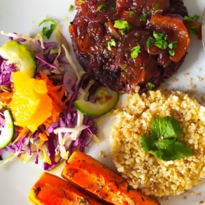 Burger de lentilles avec chutney d’été, salade russe avec mayonnaise végétalienne, salade d’été mixte et pickles
