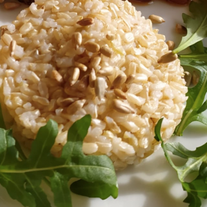 Mini pizzas aux aubergines, riz brun, salade fraîche d’été et pickles maison