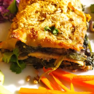 Lasagne végétalienne aux épinards et champignons, légumes sautés, salade mixte de saison, pickles